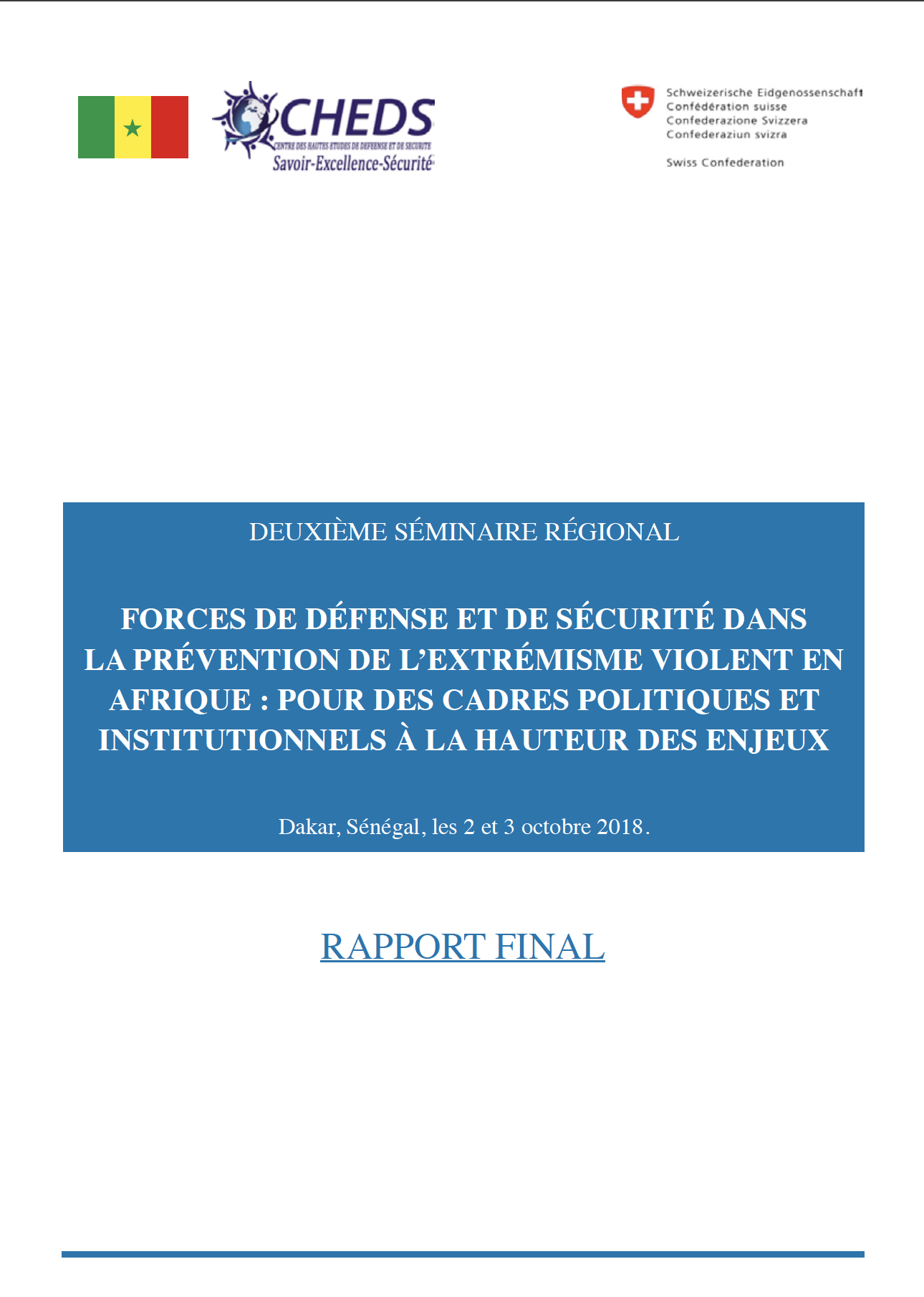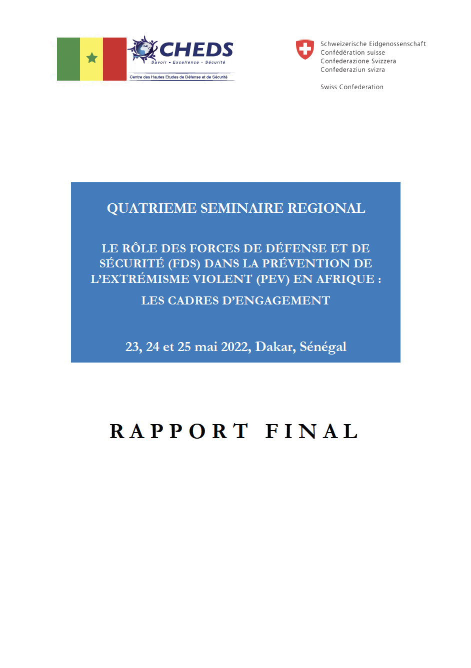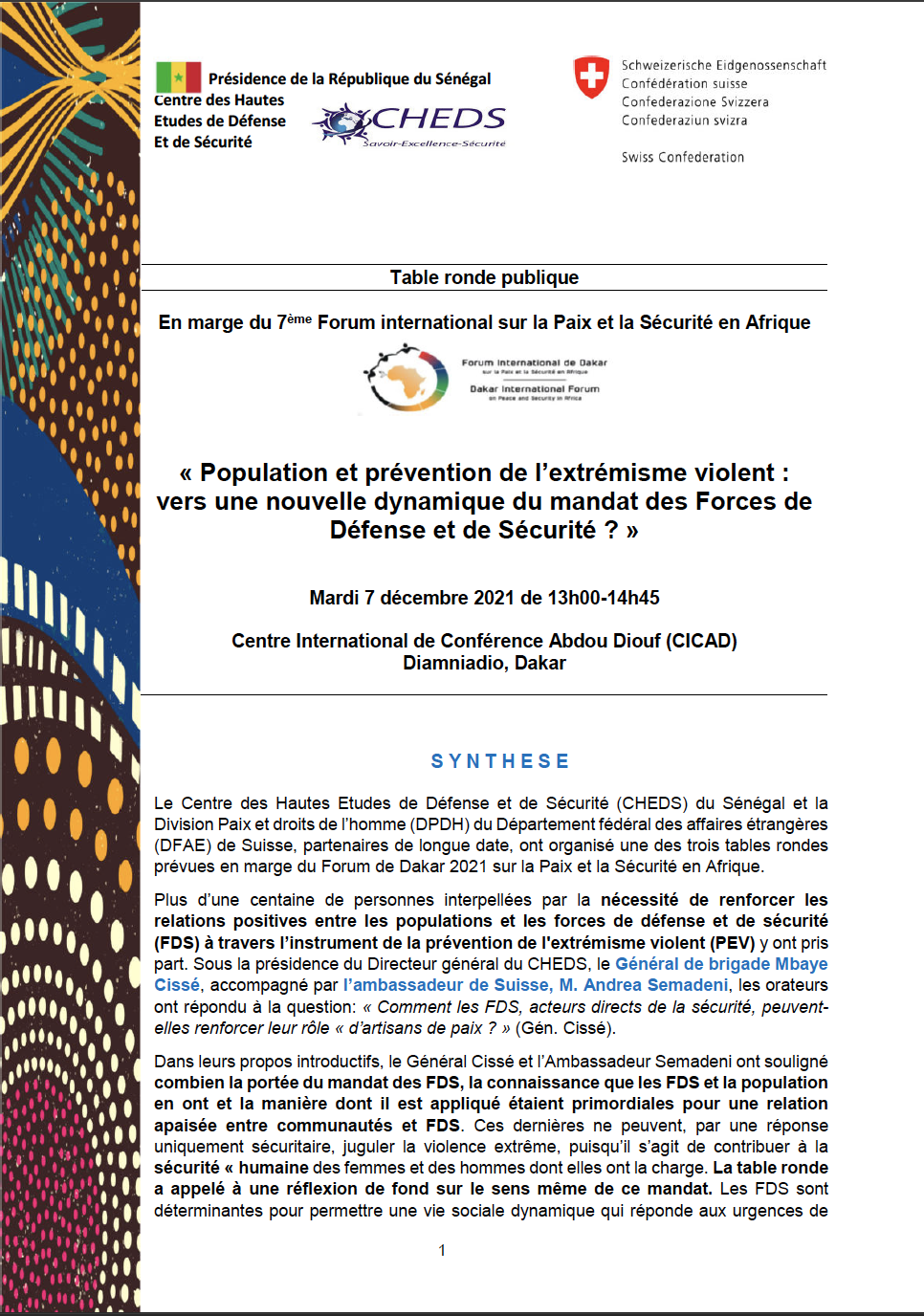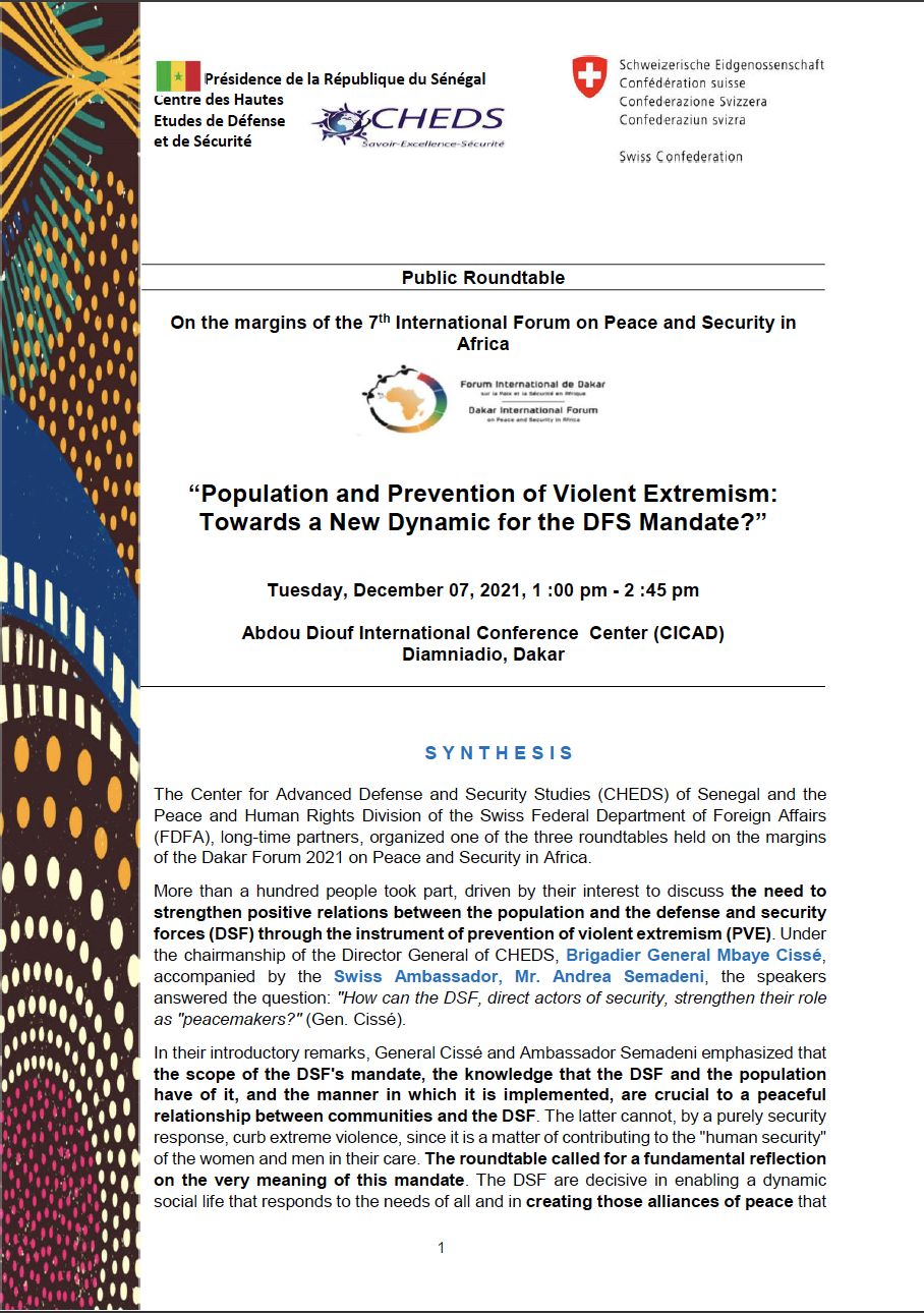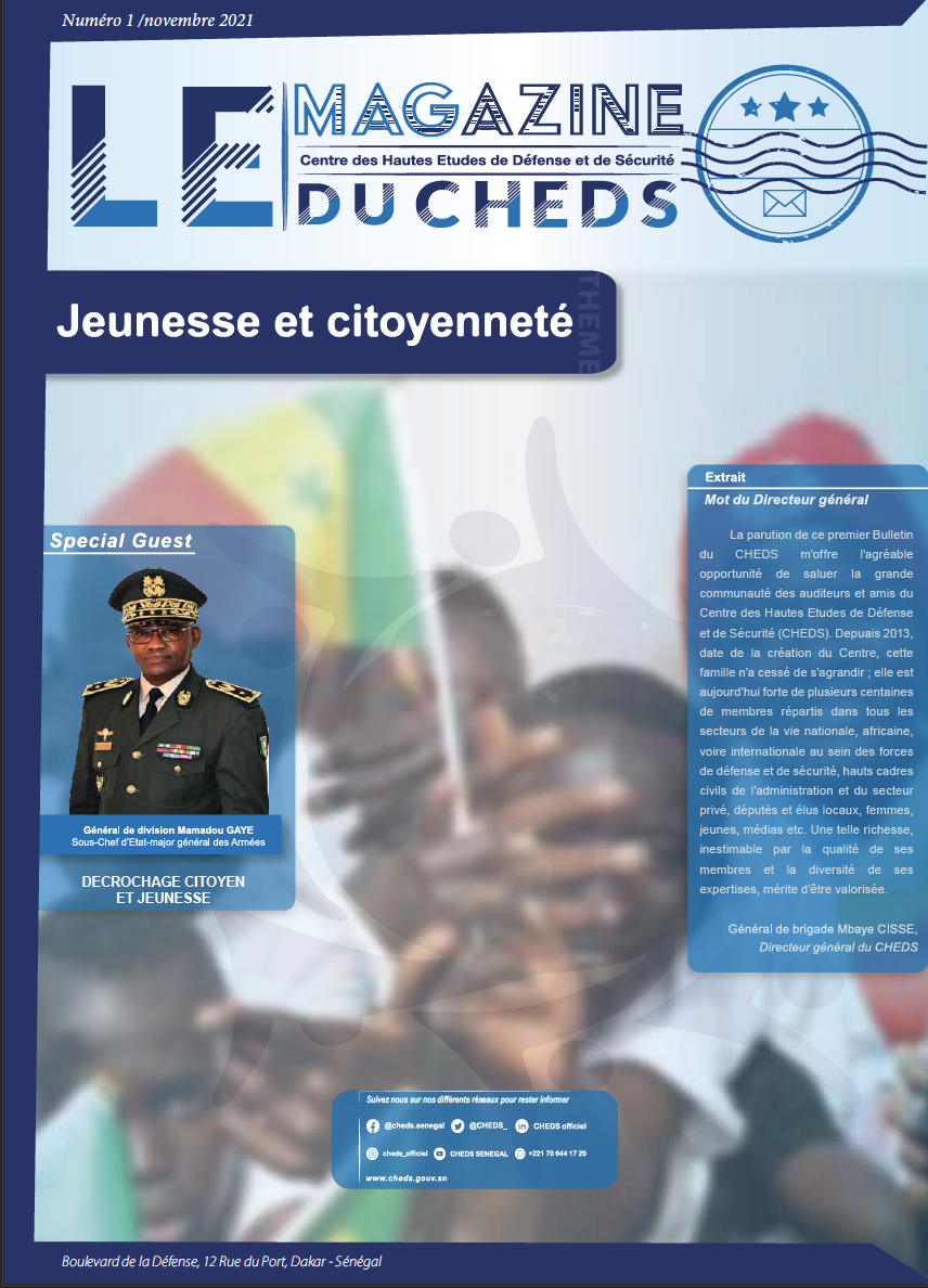 WebothèqueCHEDS2025-12-29T10:38:53+00:00Liste des ouvrages disponibles à la Bibliothèque du CHEDS Imprimer Ouvrir dans une nouvelle fenêtre Télécharger Nos publications LES CAHIERS DU CHEDSLe Sénégal à l’heure des changements globaux RAPPORT FINAL – Quatrième séminaire régional sur « le rôle des Forces de Défense et de Sécurité (FDS) dans la prévention de l’extrémisme violent (PEV) en Afrique : les cadres d’engagement » FINAL REPORT – Fourth regional seminar on “The Role of Defense and Security Forces (DSF) in Preventing Violent Extremism (PVE) in Africa: Commitment Frameworks” Briefing Paper 4 : Le rôle des Forces de défense et de sécurité dans la prévention de l’extrémisme violent Rapport final du quatrième séminaire regional sur la PEV Le citoyen dans la nouvelle guerre asymétrique : le cas du Sénégal LES CAHIERS DU CHEDS : défis sécuritaires au Sénégal La contribution du Sénégal à la justice pénale internationale en Afrique et dans le monde Le concept armée-nation : une opportunité pour la prévention de l’extrémisme violent au Sénégal Magazine numéro 2 du CHEDS Magazine numéro 3 du CHEDS Cybersécurité et démocratie Cybercriminalité, l’affaire de tous Cybersécurité, cyberguerre et cyberdéfense : réponses pour un état souverain ? Rapport final 1ère Matinée des médias 2022 : « Sécurité, Sureté et Gestion des grands évènements sportifs » Résultats de l’évaluation des opportunités pour les femmes dans les opérations de paix (MOWIP) 2020-2021 pour la gendarmerie nationale et la police nationale du Sénégal Results of the 2020-21 measuring opportunities for women in peace operations (MOWIP) assessment for the national police and the national gendarmerie of Senegal L’Afrique a l’obligation de tirer les leçons de la pandémie COVID-19. Dr. BOUSSO Chronique activités, publications, documents de référence, partenaires, liens PEV DFAE_v.2022_01_16 Table Tonde publique « S’investir pour la paix et la cohésion en Afrique : Trois ans de Conversations régionales pour la prévention de l’extrémisme violent » FDD-2018 Deuxième séminaire régional « Forces de défense et de sécurité dans la prévention de l’extrémisme violent en Afrique : pour des cadres politiques et institutionnels à la hauteur des enjeux Rôle des confréries religieuses dans la prévention de l’extrémisme violent au Sénégal Rapport webinaire médias. Juin 2021 Rapport Séminaire de lancement du Programme Jeunes, Défense, Sécurité et Paix (PJDSP) « Dividende démographique, Défense, Sécurité et Paix : Enjeux et réponses de la jeunesse africaine » Rapport Webinaire « Covid-19, au-delà de la sécurité sanitaire : gestion médiatique des aspects sécuritaires » Rapport général journée du 16 mars 2021 : « Leadership féminin : pour un futur égalitaire dans le monde de la Covid-19 » Magazine numéro 1 du CHEDS – novembre-2021 Prévenir l’extrémisme violent au Sénégal : Les menaces liées à l’exploitation aurifère Table ronde publique : « Population et prévention de l’extrémisme violent : vers une nouvelle dynamique du mandat des Forces de Défense et de Sécurité́ ? » FDD 07.12.2021. V Fr Public Roundtable “Population and Prevention of Violent Extremism: Towards a New Dynamic for the DFS Mandate?” FDD 07.12.2021_V. Eng BRIEFING PAPER – I : Le rôle de la société́ civile dans la prévention de l’extrémisme violent au Sénégal : le cas de la Casamance BRIEFING PAPER II : Recrutement et radicalisations au Sénégal : mesures pour la prévention de l’extrémisme violent Rapport général « Jeunesse, violence et sport » PJDSP Webinaire Avril 2021